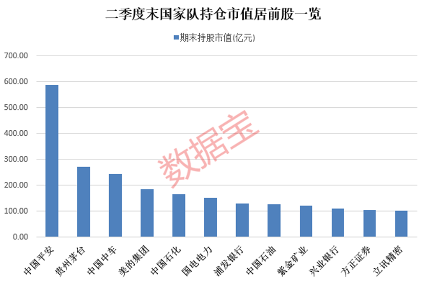 按照二季度末国家队合计持仓市值来看,持仓市值前五名是中国平安、贵州茅台、中国中车、美的集团、中国石化;持股市值超过百亿元的有12股,中国平安获国家队合计持仓586.99亿元,居首位。