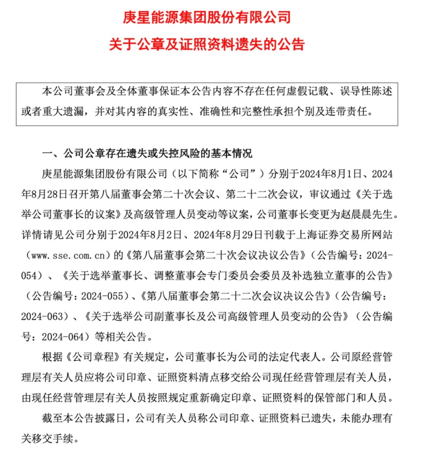 值得注意的是,8月28日,庚星股份表示,截至目前,公司有关人员称公司印章、证照资料已遗失,未能办理有关移交手续。
