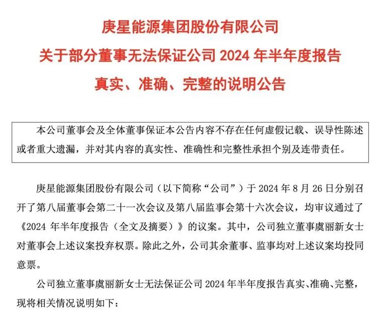 同日,庚星股份公告称,公司独立董事虞丽新无法保证公司2024年半年度报告真实、准确、完整,在公司8月26日举行的董事会会议上,对审议通过公司《2024年半年度报告(全文及摘要)》的议案投弃权票。