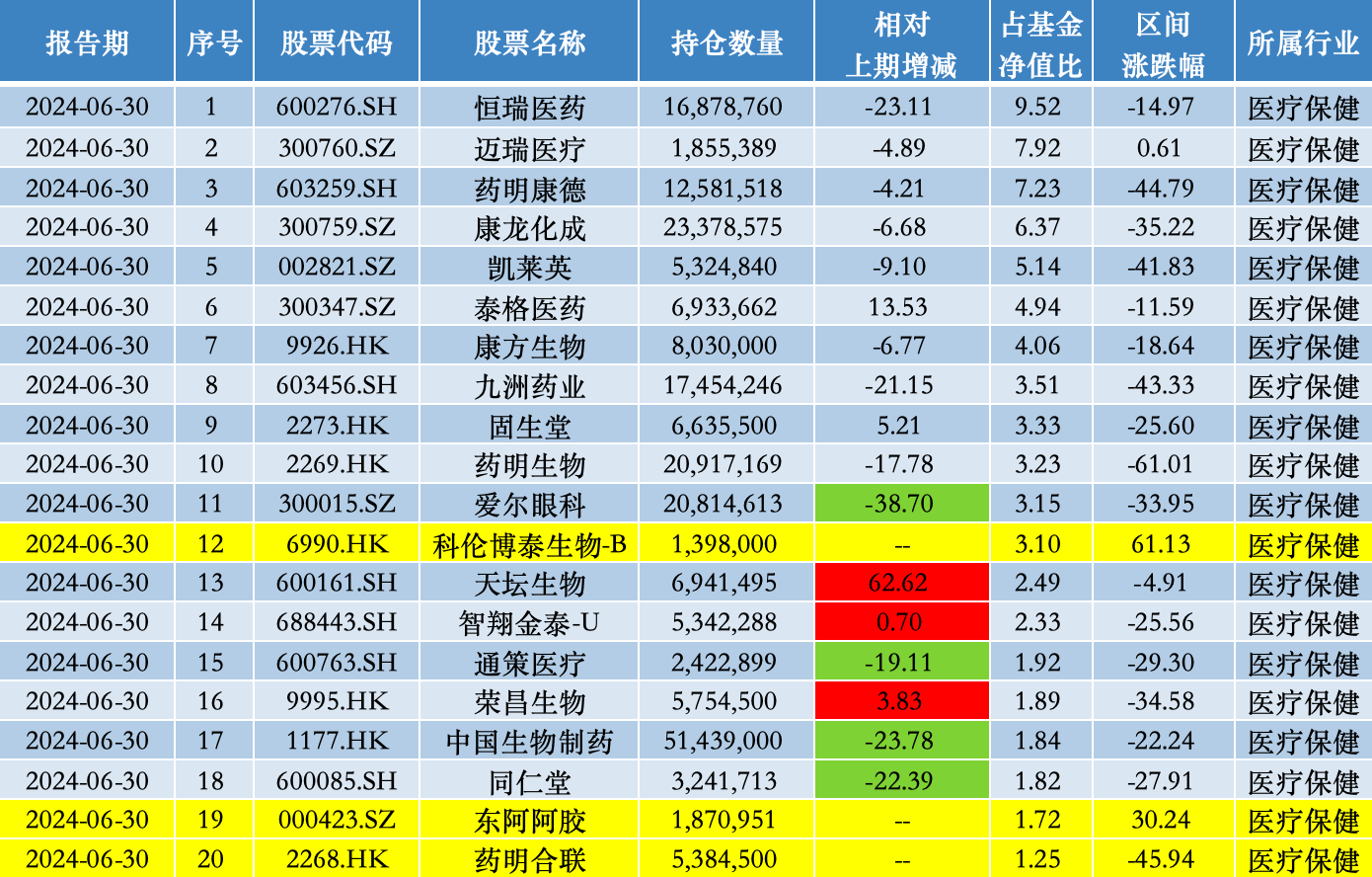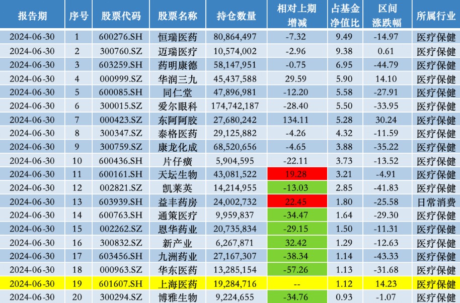从2024年中报披露的隐形重仓股持仓(第11名至第20名重仓股)来看,继2023年上半年后,上海医药重回中欧医疗健康持仓名单中;同样是医药主题基金的中欧医疗创新,则于今年上半年首次建仓科伦博泰生物、东阿阿胶、药明合联。