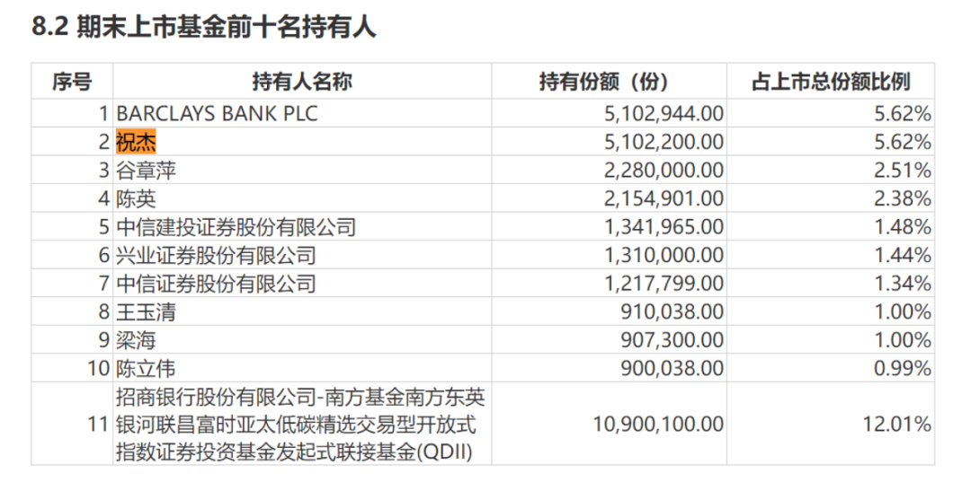 比如,南方东英银河联昌富时亚太低碳精选ETF(QDII)的半年报显示,祝杰为该基金的第二大持有人,持有该基金510.22万份,占上市总份额5.62%,换算下来约624.51万元。Wind数据显示,截至9月3日,南方东英银河联昌富时亚太低碳精选ETF(QDII)今年以来的涨幅高达12.89%,这意味着如果祝杰是在年初买入这只基金并持有到现在,已经赚取了约70万元。