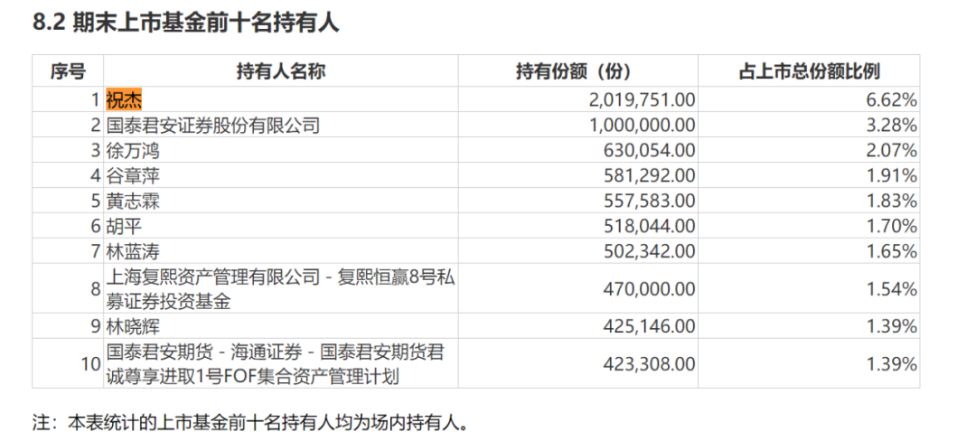 再比如,易方达标普医疗保健指数(QDII-LOF)的半年报显示,祝杰为该基金的第一大持有人,持有该基金约201.98万份,占上市总份额6.62%,换算下来约378.93万元。同时,华宝标普美国品质消费股票(QDII-LOF)的半年报显示,祝杰为该基金的第二大持有人,持有该基金约99.26万份,占上市总份额4.05%,换算下来接近240.11万元。