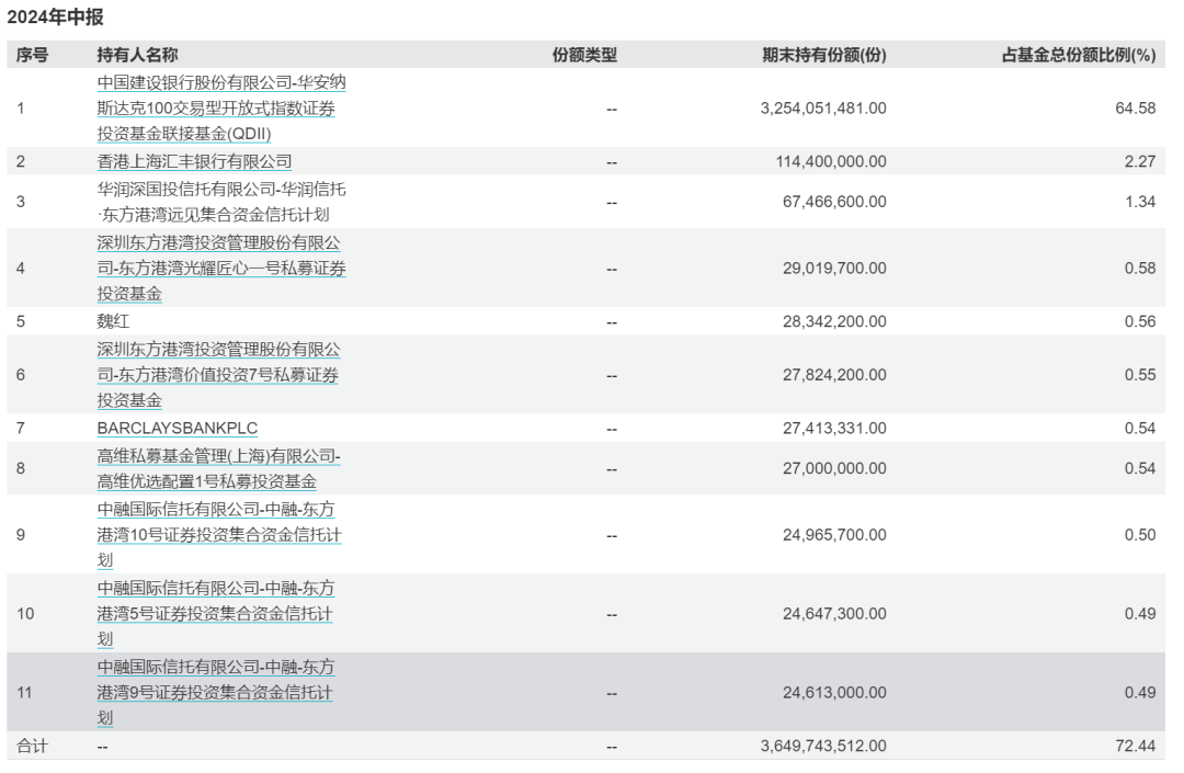 比如,在华安纳斯达克100ETF6月底的前十大持有人中,有6只东方港湾旗下产品,包括华润信托·东方港湾远见集合资金信托计划、东方港湾光耀匠心一号私募证券投资基金、东方港湾价值投资7号私募证券投资基金、东方港湾10号证券投资集合资金信托计划、东方港湾5号证券投资集合资金信托计划、东方港湾9号证券投资集合资金信托计划,分列第三,第四,第六,第九,第十,第十(并列),合计持有份额1.99亿份,持有规模3.22亿元。