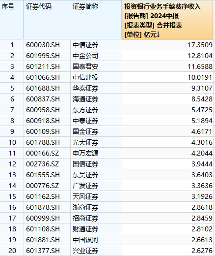 2024年上半年上市券商投行业务手续费净收入前20名排行。Wind数据截图