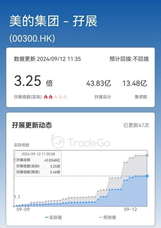 从动态来看,美的集团此次公开发售进展不快,直到9月11日下午才实现足额认购,共用了两天多时间。9月12日上午,其孖展还一度抽飞149万港元,最终以43.83亿港元收官,超额认购2.25倍。