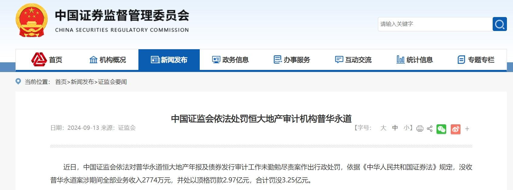 中国证监会依法对普华永道恒大地产年报及债券发行审计工作未勤勉尽责案作出行政处罚,依据《中华人民共和国证券法》规定,没收普华永道案涉期间全部业务收入2774万元,并处以顶格罚款2.97亿元,合计罚没3.25亿元。