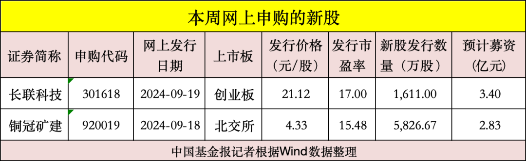 虽然本周只有3个交易日,但是有两只新股迎来网上发行,一只是9月18日网上申购的铜冠矿建,发行价为4.33元/股,为今年以来“最便宜”的新股;另一只是9月19日网上申购的长联科技,发行价为21.12元/股。