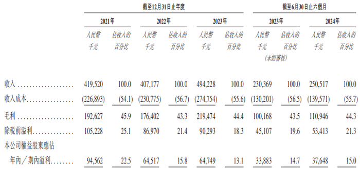 财务数据显示,2021年至2023年及2024年上半年,爱维艾夫实现收入分别是4.2亿元、4.07亿元、4.94亿元及2.51亿元;毛利分别为1.93亿元、1.76亿元、2.19亿元及1.11亿元;毛利率分别为45.9%、43.3%、44.4%及44.3%;录得年内溢利分别为9456.2万元、6451.7万元、6474.9万元及3764.8万元。