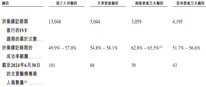 2021年至2023年及2024年上半年,湛江久和医院的成功率分别是57%、55.7%、51.4%及49.9%,天津爱维医院的成功率分别是58.1%、55.2%、55.2%及54.8%,昆明爱维艾夫医院的成功率分别为56.6%、56.6%、53.6%及51.7%。