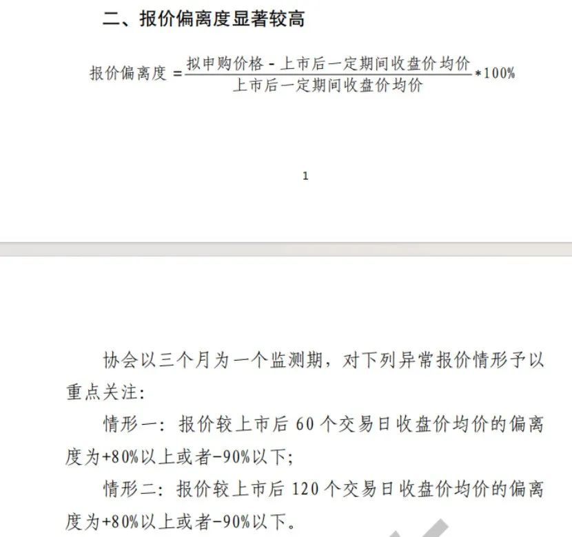 中证协以三个月为一个监测期,对下列异常报价情形予以重点关注。一是报价较上市后60个交易日收盘价均价的偏离度为+80%以上或者-90%以下。二是报价较上市后 120个交易日收盘价均价的偏离度为+80%以上或者-90%以下。