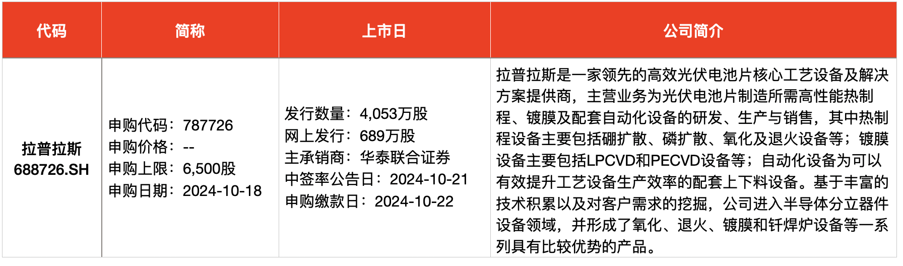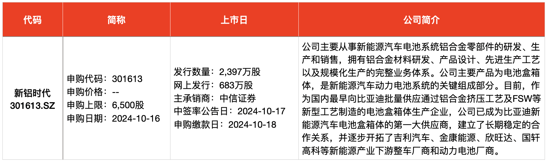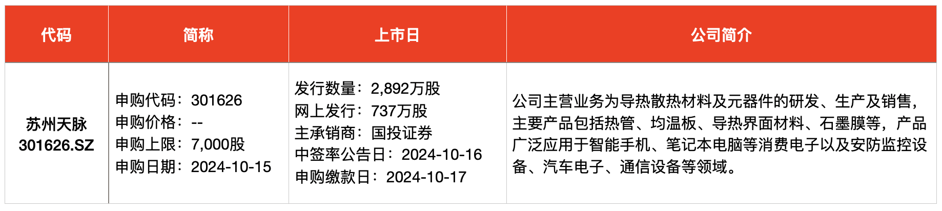 澎湃新闻根据Wind及公开信息梳理统计,本周(10月14日-10月18日),安排3只新股网上申购。申购的新股为苏州天脉导热科技股份有限公司(简称“苏州天脉”,301626.SZ)、重庆新铝时代科技股份有限公司(简称“新铝时代”,301613.SZ)、拉普拉斯新能源科技股份有限公司(简称“拉普拉斯”,688726.SH)。其中,苏州天脉为散热解决方案提供商,覆盖OPPO、vivo、华为、荣耀、比亚迪等知名品牌;新铝时代则是比亚迪新能源汽车铝合金电池盒箱体的第一大供应商;拉普拉斯则受到下游龙头隆基绿能、晶科能源广泛认可入股。