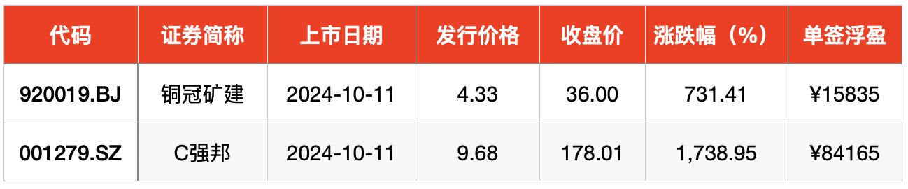 10月11日,铜冠矿建在北交所上市,发行价为4.33元/股。上市首日,该股股价持续飙升,截至收盘报36元,涨幅731.41%。以收盘价计算,投资者中一签浮盈高达15835元。