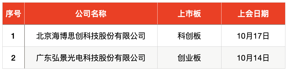 本周,上交所上市审核委员会定于2024年10月17日召开2024年第25次上市审核委员会审议会议,届时将审议北京海博思创科技股份有限公司(简称“海博思创”)IPO申请。深交所发布将于10月14日召开2024年第17次上市审核委员会审议会议,审议的发行人为广东弘景光电科技股份有限公司(简称“弘景光电”)。