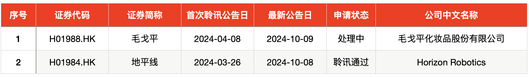 上周,港股共有1企业更新招股书,为毛戈平化妆品股份有限公司(简称“毛戈平”);地平线(Horizon Robotics)通过聆讯。