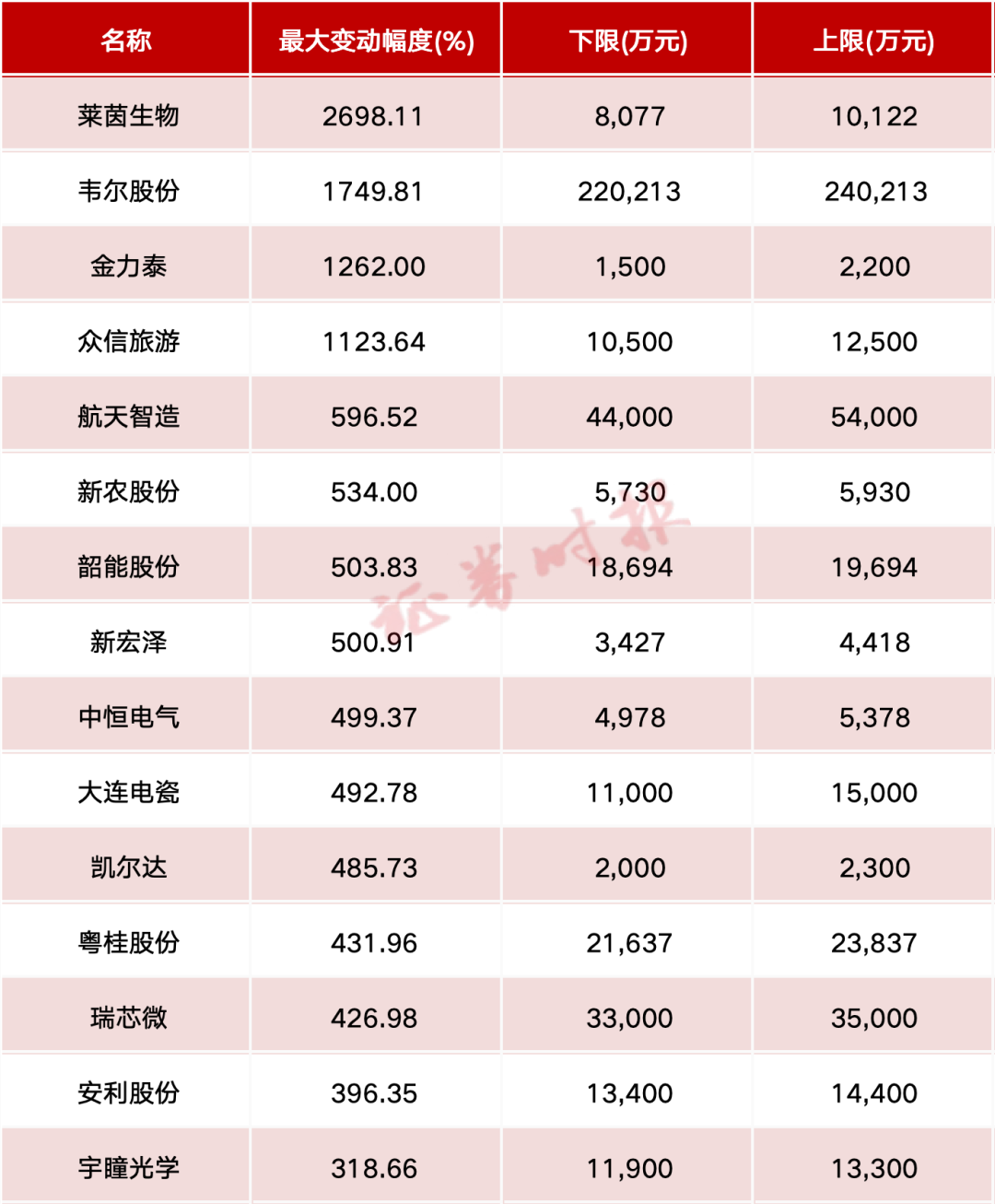 若从扣非净利润来看,54家公司预计今年前三季度同比最大增幅超过100%。其中,莱茵生物、韦尔股份、金力泰、众信旅游等4家公司超过10倍。