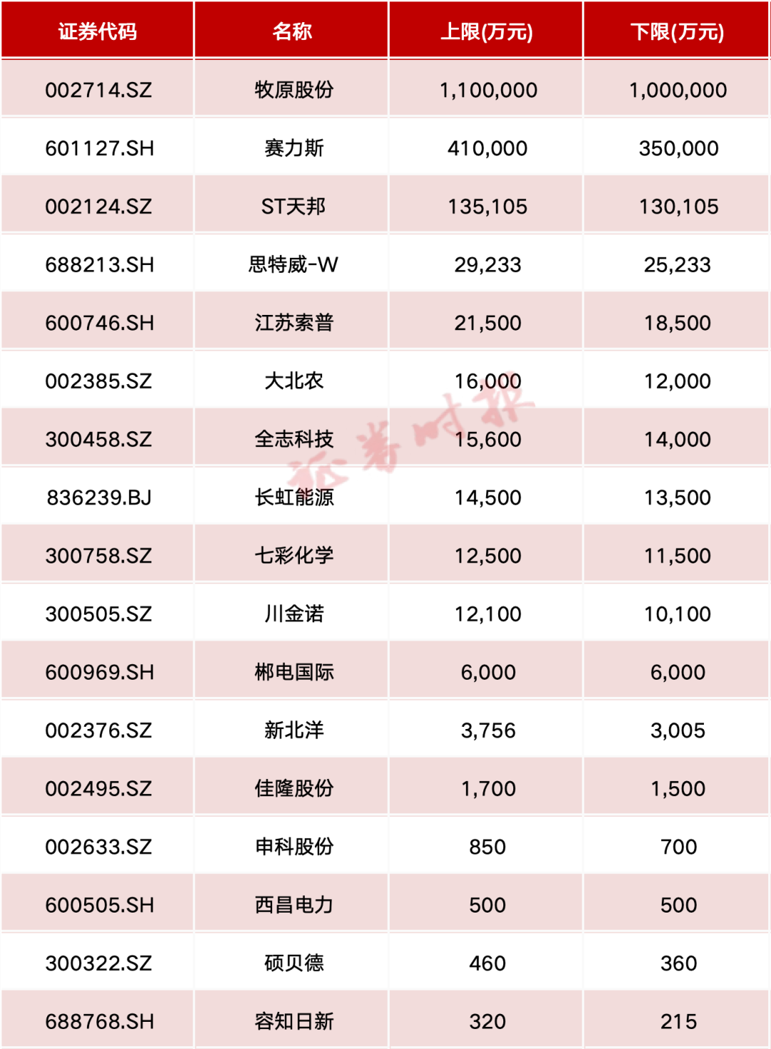 其中,中国人寿、中国太保、中远海控、中国人保、新华保险、牧原股份6家公司预计将超过100亿元。