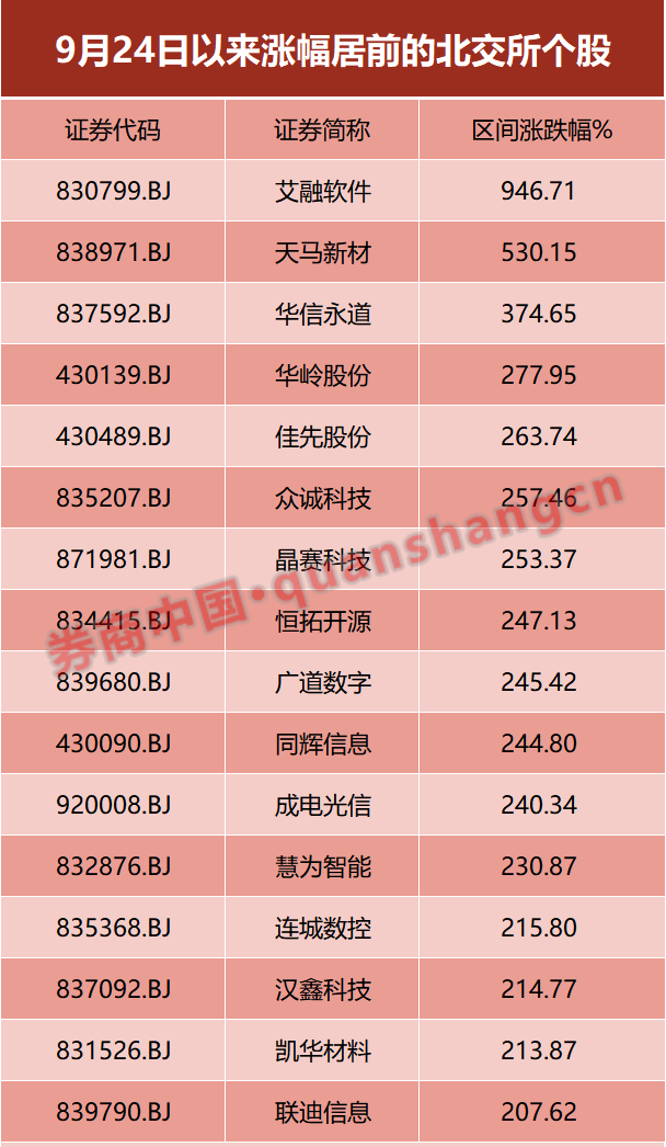 拉长时间来看,自9月24日启动反弹以来至今,北证50指数累计涨幅超过100%,仅用15个交易日就实现了翻倍。个股方面,在此期间内,艾融软件涨约947%,逼近“十倍股”,天马新材涨逾五倍,华信永道涨近375%,华岭股份、佳先股份、众诚科技等13只个股涨超两倍。