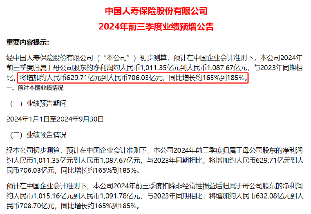 10月16日收盘后,中国人寿发布2024年前三季度业绩预增公告。中国人寿表示,预计公司2024年前三季度归属于母公司股东的净利润约人民币1011.35亿元到人民币1087.67亿元,与2023年同期相比,将增加约人民币629.71亿元到人民币706.03亿元,同比增长约165%到185%。