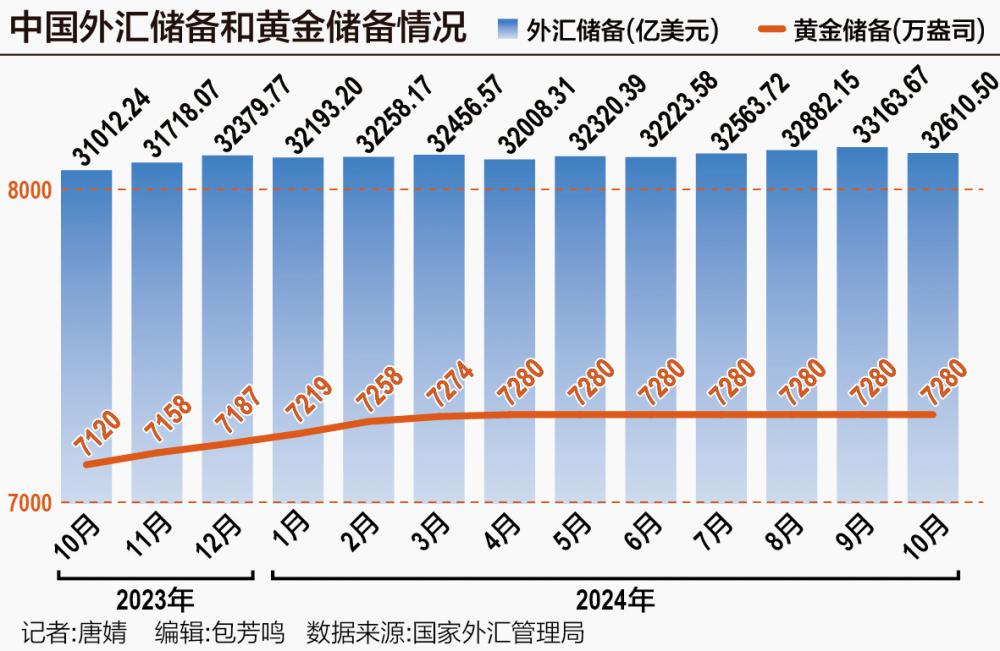 11月7日,国家外汇管理局发布统计数据,截至2024年10月末,我国外汇储备规模为32610.50亿美元,较9月末的33163.67亿美元,减少553.17亿美元,降幅为1.67%。