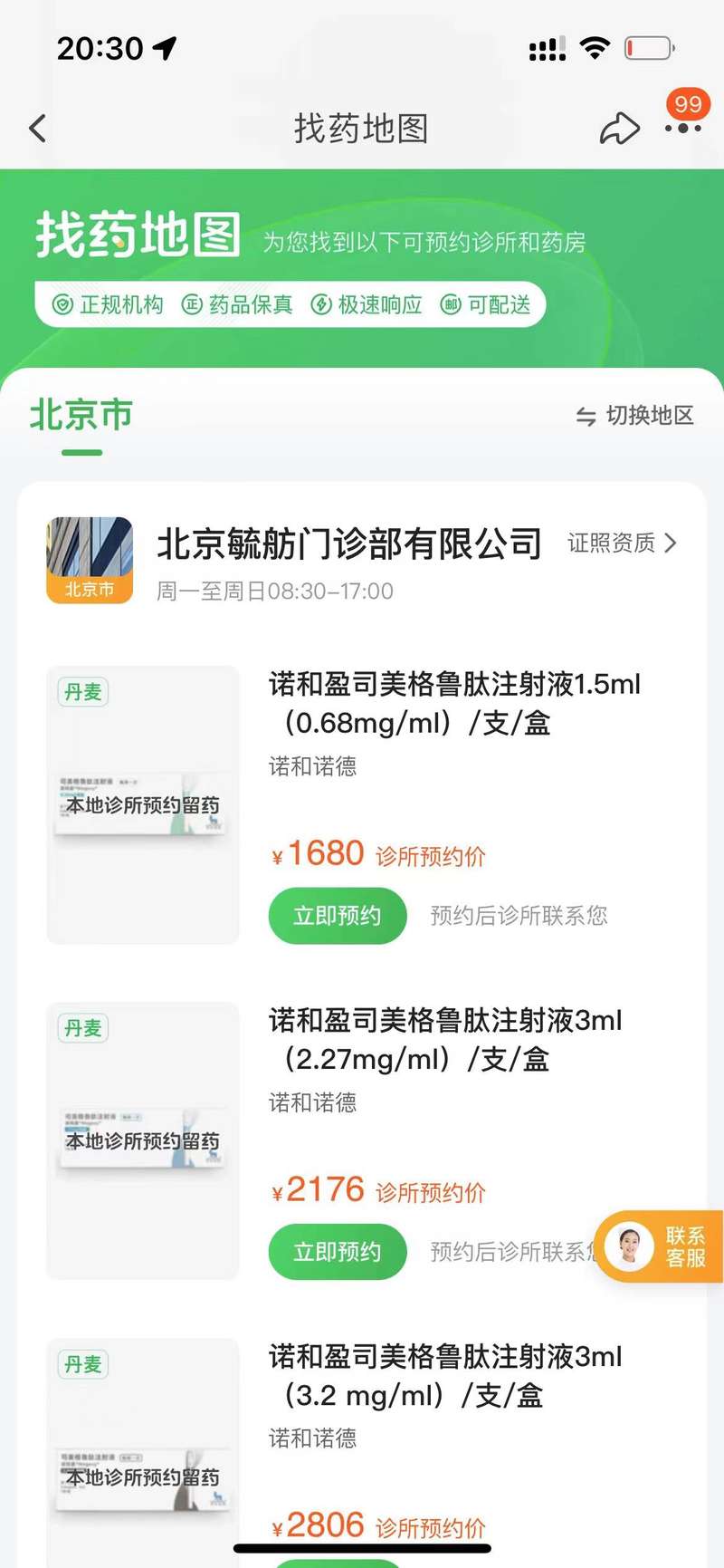 贝壳财经记者搜索看到,当前,线上平台依托医疗机构上线了司美格鲁肽注射液的预约诊疗服务。11月21日,贝壳财经记者在淘宝、京东等线上平台上搜索诺和盈产品,随即跳转至便民找药界面,该界面显示,多地医疗机构提供挂号诊疗拿药预约服务。京东上,北京地区目前只有三个医疗机构提供相应的服务,包括北京毓舫门诊部、爱康国宾和北京长阳妇儿门诊部。