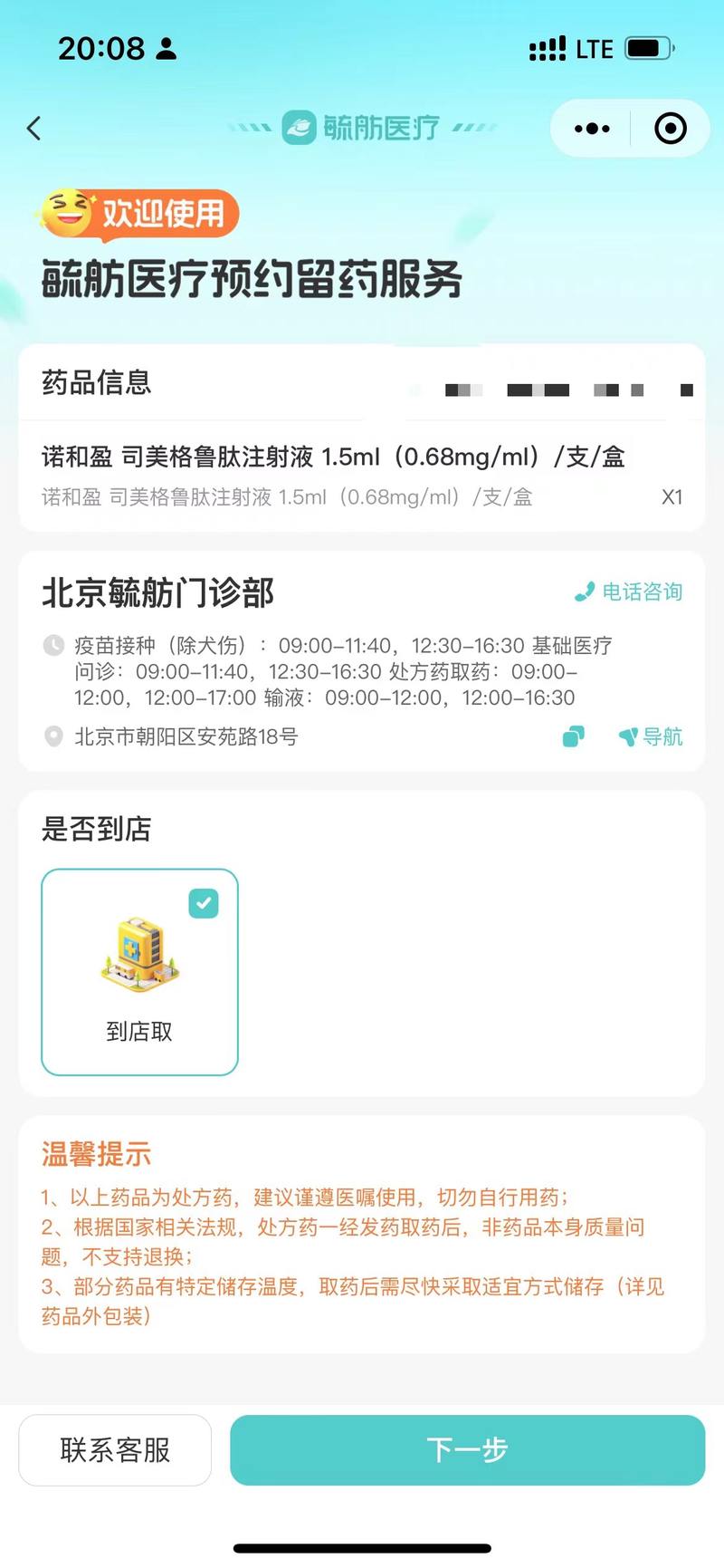 11月21日,贝壳财经记者在北京毓舫门诊部体验下单过程中,门店客服称需要通过短信发送的链接进行预约信息登记,填写完相应个人信息后进行预约取药。