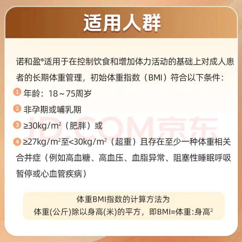实际上,诺和盈为处方药,适用人群包括BMI≥30kg/m2或>27kg/m2至<30kg/m2且存在至少一种体重相关合并症,例如高血糖、高血压、血脂异常、阻塞性睡眠呼吸暂停或心血管疾病。