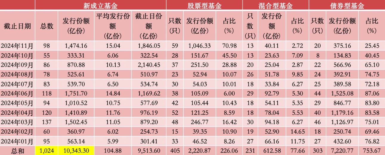 其中,11月新成立基金的发行份额为1474.16亿份,新发基金数量为98只。这也是2024年下半年以来,基金发行数量和规模最高的一个月。