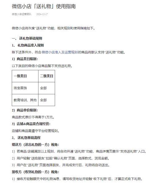 12月17日,微信小店推出“送礼物”功能的灰度测试,并发布了相应的功能使用指南。根据公告,除珠宝、教育培训类目,且商品款式原价不得高于1万元的商品将默认支持“送礼物”功能。