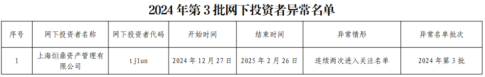 12月26日,中国证券业协会公布2024年第3批网下投资者异常名单,上海烜鼎资产管理有限公司(简称“上海烜鼎”)在列,列入异常名单时限为2024年12月27日至2025年2月26日。