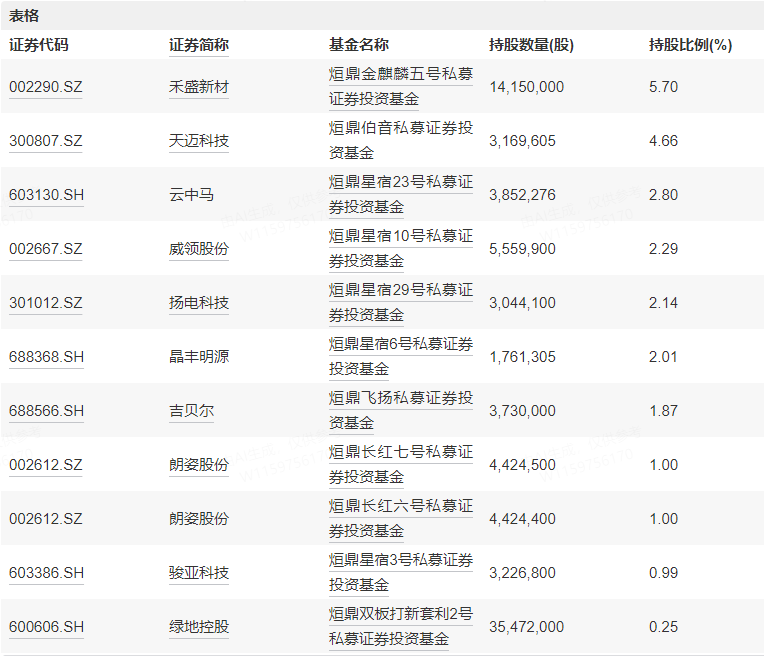 此外,数据显示,上海烜鼎的旗下基金还是禾盛新材、天迈科技、 云中马等多家上市公司的十大股东。