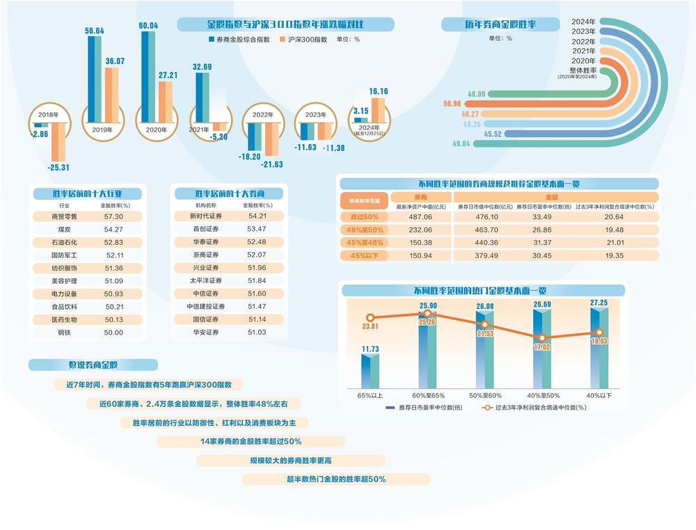 据证券时报·数据宝统计,自2020年以来,以近60家券商推荐的2.4万条金股数据为样本,计算自推荐首日到截止日的涨跌幅,并与金股所属行业指数同期涨跌幅对比,统计券商金股的胜率(跑赢指数样本数/总样本数)。
