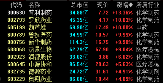 1月3日,医药股盘中走势活跃,普利制药涨超13%,鲁抗医药、新华制药、罗欣药业涨停,热景生物涨超9%,中源协和涨超5%。