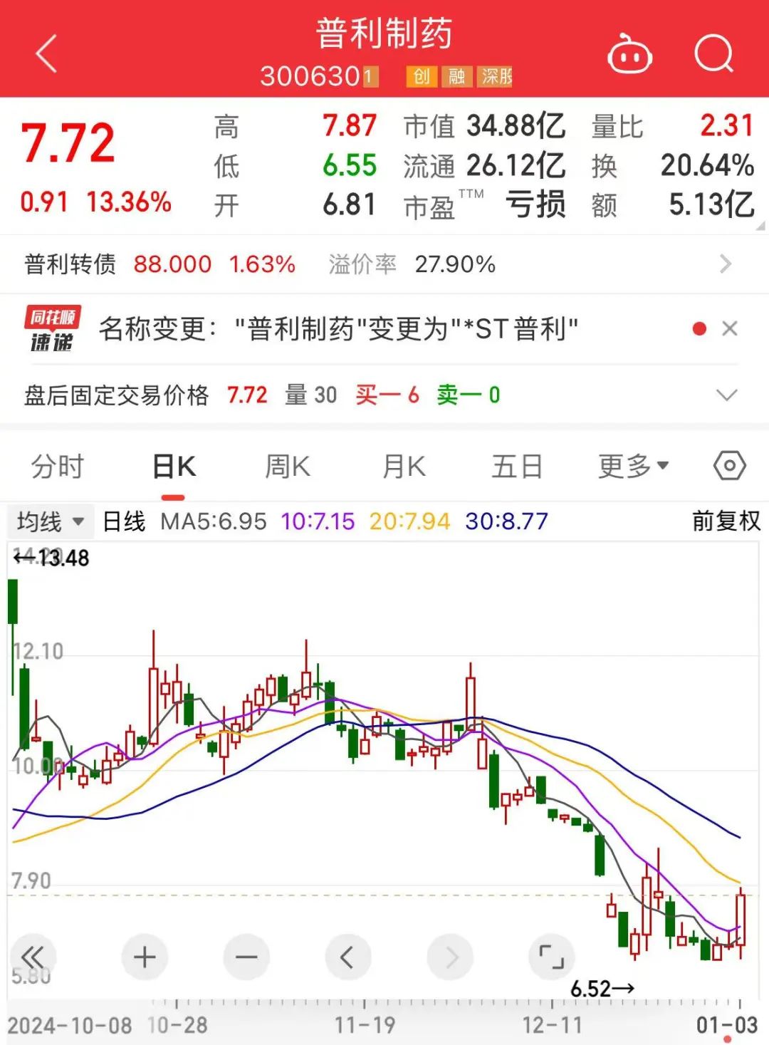 1月3日,普利制药股价大涨13.36%,收盘报7.72元/股,目前总市值34.88亿元。
