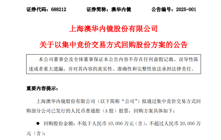 澳华内镜(688212)拟通过集中竞价交易方式回购部分股票,回购股份金额不低于人民币1亿元,不超过人民币2亿元。回购股份资金来源为公司自有资金及中信银行股份有限公司上海分行提供的股票回购专项贷款。回购股份价格不超过人民币45元/股。
