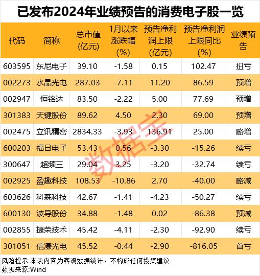 目前,已有11家公司公布了2024年业绩预告,其中立讯精密、水晶光电、天键股份、恒铭达、东尼电子业绩预喜。
