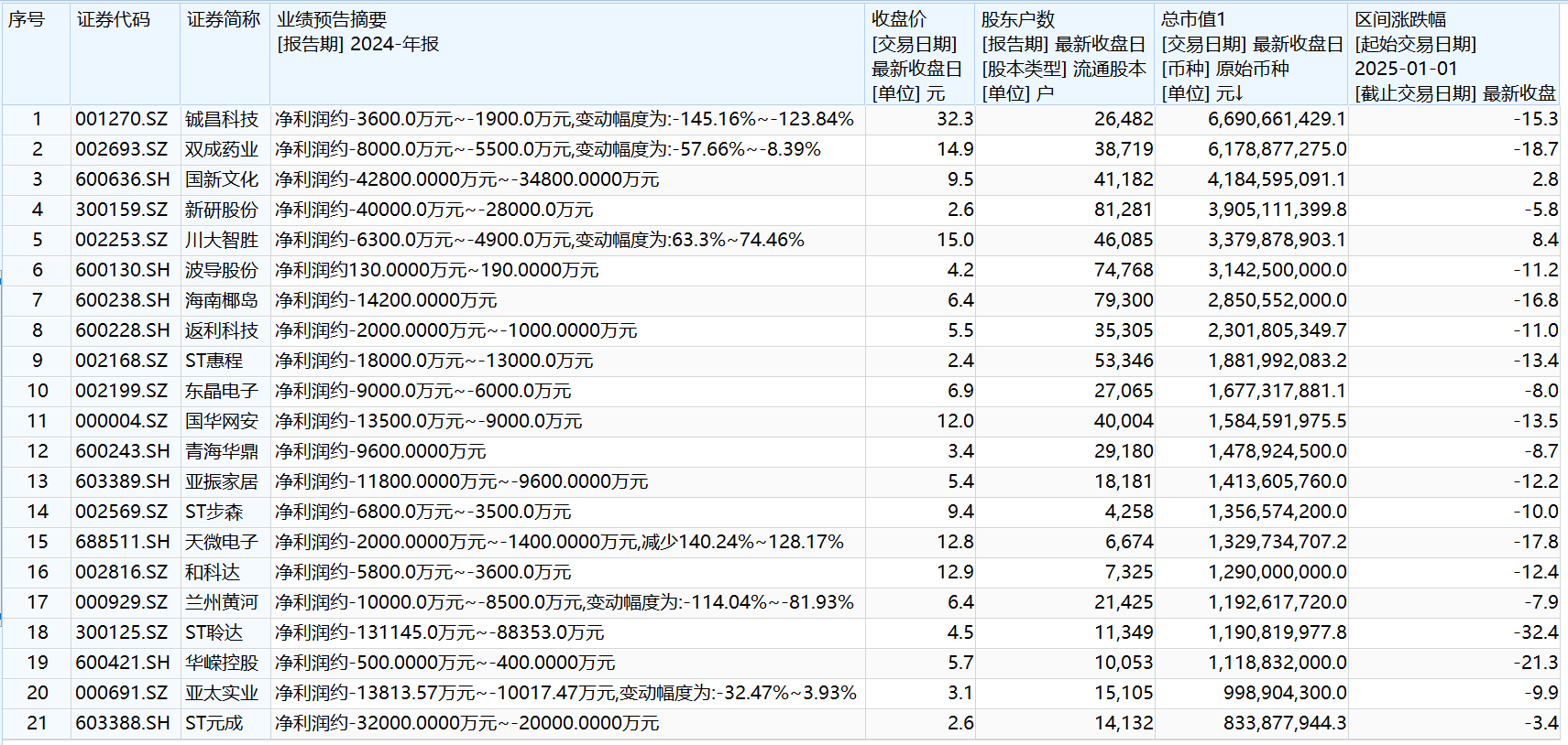 上述公司也同步发布了业绩预告,公司业绩均呈现不同程度的亏损。具体而言,铖昌科技、天微电子(688511.SH)预计2024年净利润同比下滑均超过100%;兰州黄河(000929.SZ)净利润同比下滑变动幅度为81.93%-114.04%;双成药业、亚太实业(000691.SZ)净利润也呈现不同程度的同比下滑。