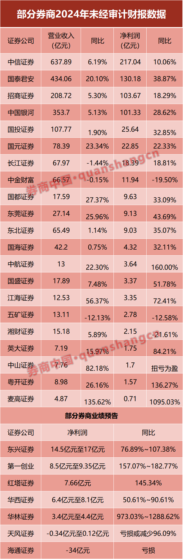 上周,借由上市公司公告,又有11家券商的2024年业绩得以窥见真容。在已有数据统计的28家券商中,有23家业绩预喜,净利润均实现了同比增长;与此同时,也有5家券商净利润同比下滑,甚至有两家期内(可能)出现亏损。