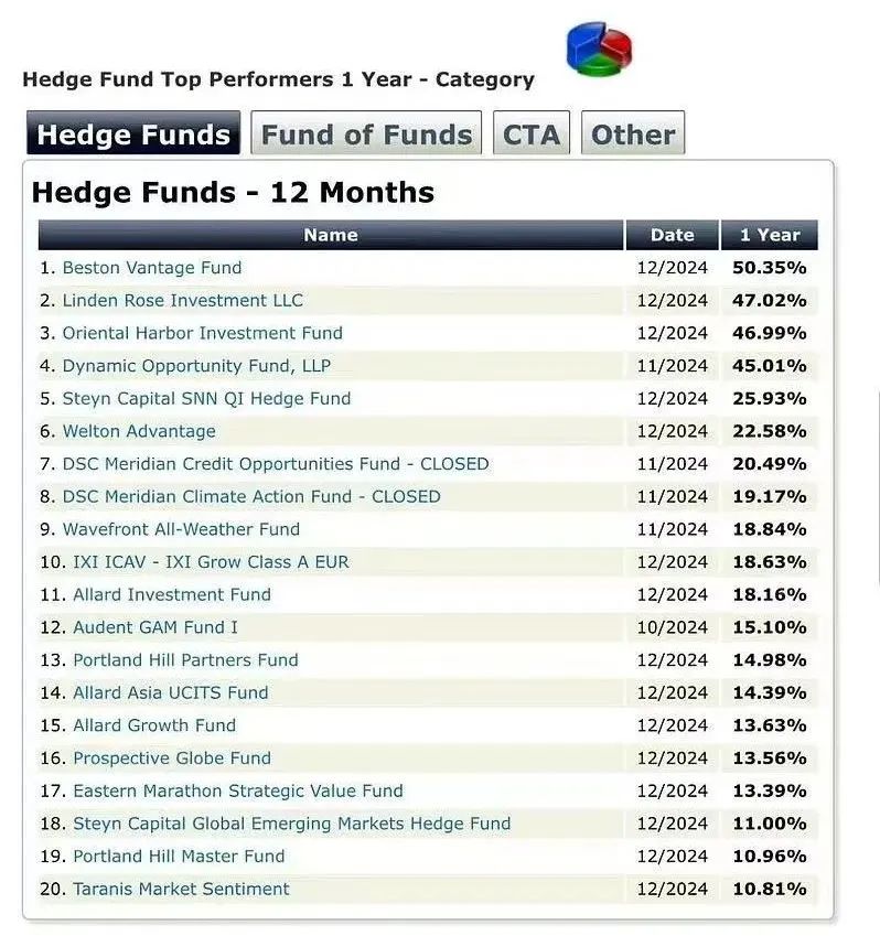 整个2024年,东方港湾海外基金表现出色。在Morgan Hedge一年期对冲基金收益排名中,该基金以46.99%的收益排名第三。该榜单收录了全球9956只管理规模在千万美元以上基金的业绩。