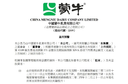 该人士指出,本次减值属于非经营性、非持续性事件,影响的是商誉减值等会计处理影响后的报表端净利润,并不能反映蒙牛实际业务运营层面的核心盈利能力。而公告的“毛利率和经营利润率同比明显提升……但受两项减值因素影响,预期本集团2024年公司拥有人应占利润约为0.5亿-2.5亿元。若剔除上述减值影响,公司拥有人应占利润同比仍然稳健”的表述,说明公司扣非后净利润表现或超预期。