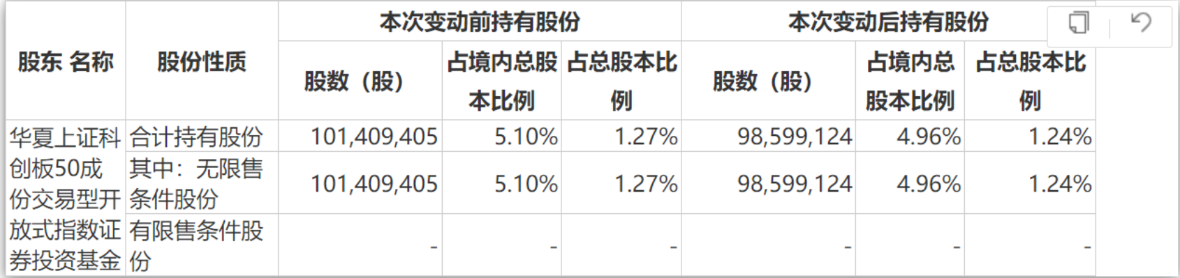 数据显示,截至第三季度报,华夏上证科创50ETF是中芯国际在A股的第一大流通股东。最新公告显示,该基金持有公司1.01亿股,占境内总股本5.10%,占总股本1.27%。本次减持281万股(变动比例0.14%)之后,该基金持有0.99亿股,占境内总股本4.96%,占总股本1.24%。