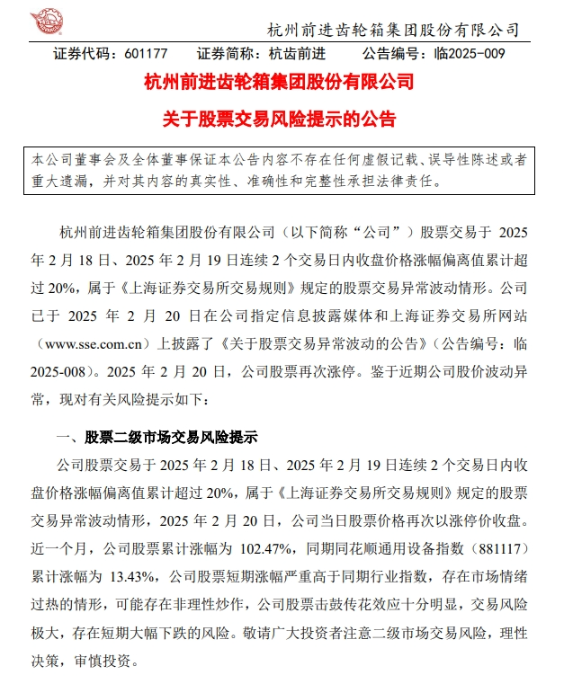 2月20日晚间,杭齿前进发布股票交易风险提示的公告,近一个月,公司股票累计涨幅为102.47%,同期同花顺通用设备指数(881117)累计涨幅为13.43%,公司股票短期涨幅严重高于同期行业指数,存在市场情绪过热的情形,可能存在非理性炒作。