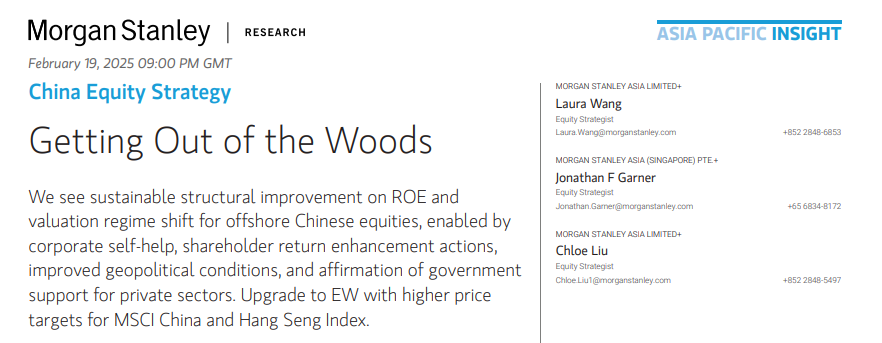 继高盛、瑞银、美银之后,本周摩根士丹利最新加入看多中国股市的行列。摩根士丹利中国首席股票策略师王滢及团队发表最新观点,认为在中国科技突破的推动下,中国股市将出现更加可持续的反弹。因此上调MSCI中国指数评级,并同步上调恒生指数、恒生国企指数和MSCI中国指数的2025年底的目标点位。