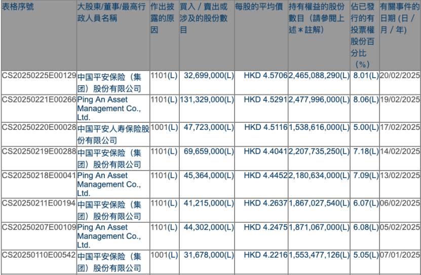 根据港交所披露数据,平安人寿在2月17日买入4772.3万股农业银行H股,每股均价为4.5116港元,耗资2.15亿元,交易后持股比例5%。