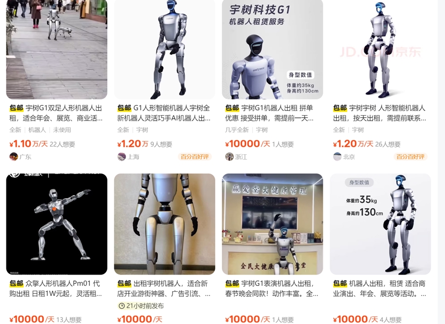 近日,记者浏览社交平台、购物平台以及二手平台发现,人形机器人二手租赁业务不断兴起。产品页面信息显示,这些出租的机器人可用于商业活动、展演和表演,用途五花八门——新店开业、巡游暖场、企业宣传活动、学校科普……出租价格在每天5000元到15000元不等,档期还很紧张。