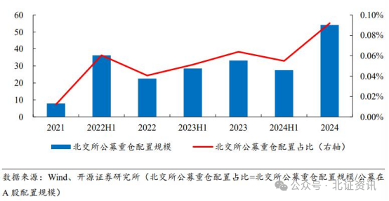 实际上,根据公募基金披露的2024年年报,公募基金对北交所公司的重仓投资情况已经浮出水面。据开源证券分析师诸海滨指出,从公募机构在北交所配置金额角度来看,2024年公募机构在北交所重仓配置金额实现高增长。2021—2024年北交所公募配置重仓占比整体呈现增长趋势,2021—2023年北交所公募机构在北交所重仓配置金额分别为7.90亿元、22.60亿元、33.22亿元,其中2024年公募重仓配置北交所金额创新高,为54.18亿元,同比增长63.08%,占比公募在A股市值的0.09%,同比增长0.03pcts。