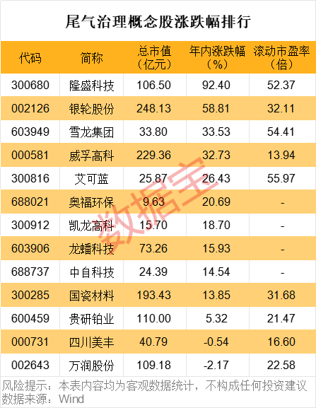 据证券时报·数据宝统计,A股市场方面,尾气治理相关个股有十余只,代表性企业包括艾可蓝、凯龙高科、中自科技、贵研铂业、威孚高科等。