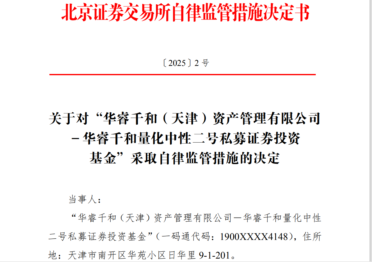 “华睿千和(天津)资产管理有限公司-华睿千和量化中性二号私募证券投资基金”也曾因异常交易于2024年10月9日、2024年10月30日、2024年10月31日、2024年11月7日被北交所采取监管关注、出具警示函、暂停证券账户交易等自律监管措施。