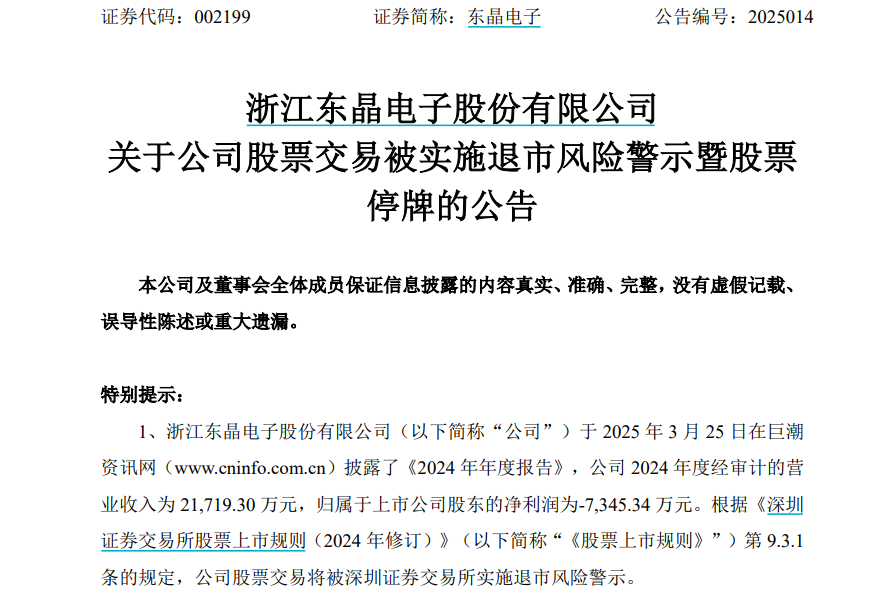 3月24日晚间,东晶电子发布公告称,公司股票交易将被深交所实施退市风险警示。公司股票3月25日开市起停牌一天,3月26日复牌起被实施退市风险警示,股票简称由“东晶电子”变更为“*ST东晶”。