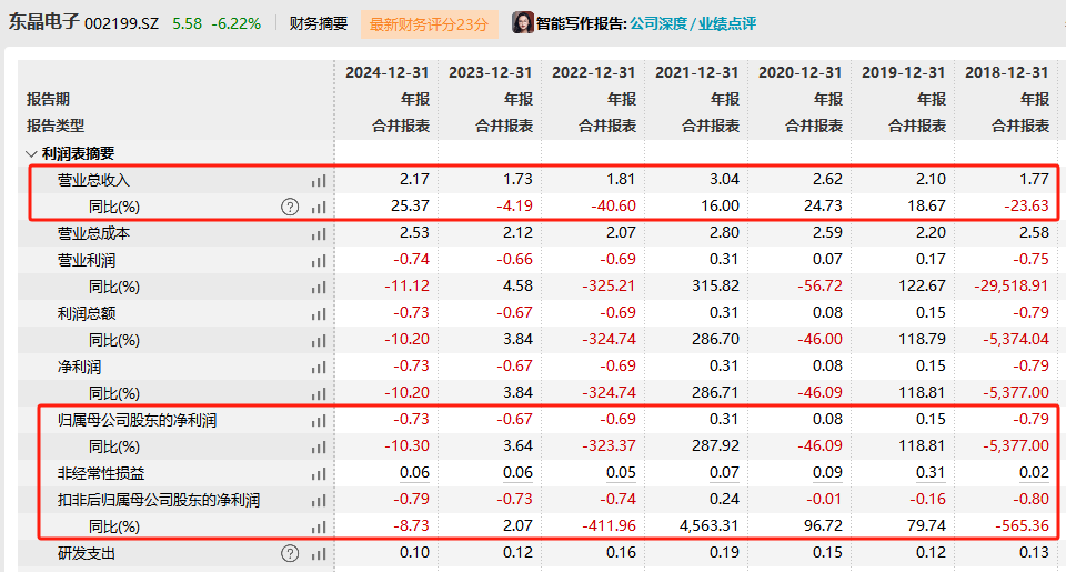 3月24日,东晶电子同时披露了2024年年度报告,报告期内营业收入为2.17亿元,同比增长25.37%;归属于上市公司股东的净利润为-7345.34万元,较上年亏损扩大。拉长时间来看,东晶电子业绩表现长期承压,2022年以来连续亏损。