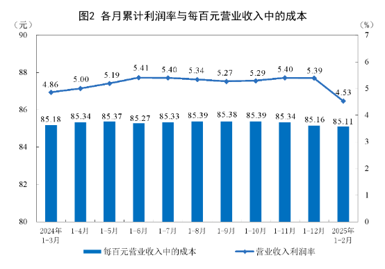 1—2月份,规模以上工业企业每百元营业收入中的成本为85.11元,同比增加0.11元;每百元营业收入中的费用为8.56元,同比减少0.09元。